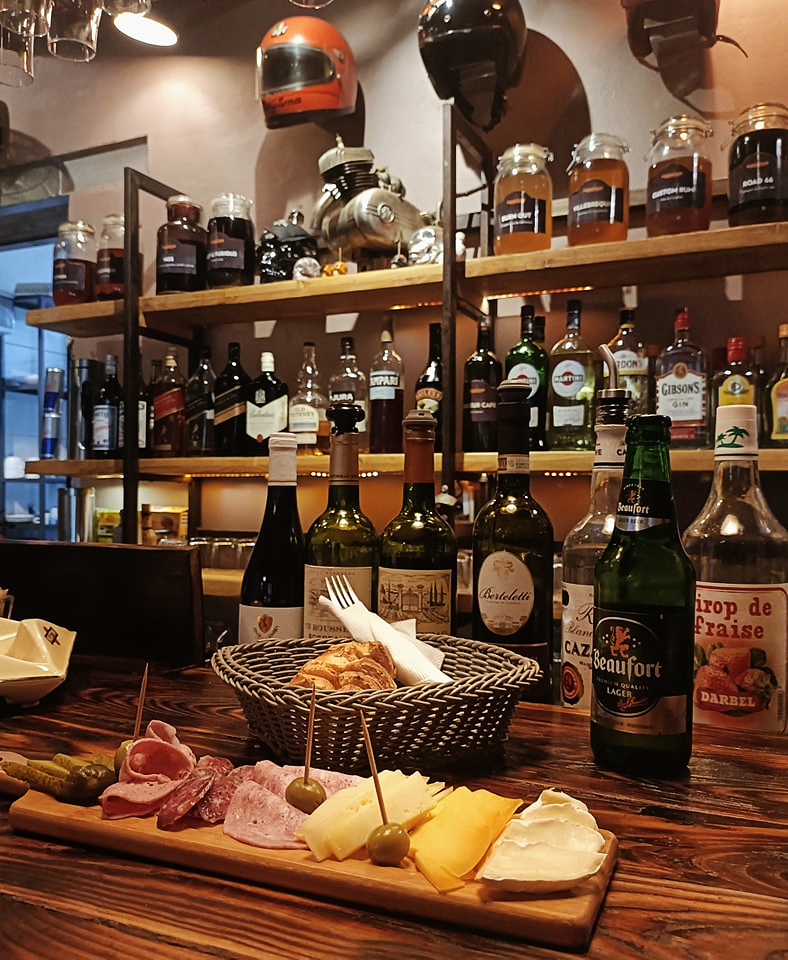 As you step inside, the distinctive décor captures your attention immediately. Inspired by road trips and the thrill of adventure, the furnishings mix leather, wood, and metal, creating an authentic motorcycle vibe. The atmosphere is electric yet relaxed, perfect for unwinding with friends after a long day or revving up for a lively evening.